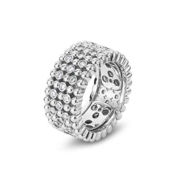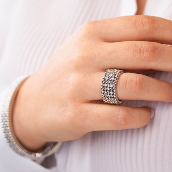 Anello in bronzo rodiato a fascia larga con superficie esterna caratterizzata da una texture sferica e zirconi incastonati. Dotato di regolatore interno che permette l’indosso in modo adattivo.