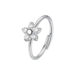 Anello donna in acciaio con fiore e zircone bianco Misura regolabile Misura fiore: 8 x 8 mm Diametro zirconi: 2,5 mm. Ispirato alla bellezza della natura, questo gioiello incanta con il suo design floreale raffinato. Perfetto per chi desidera aggiungere un tocco di delicatezza e grazia al proprio stile quotidiano, trasmette una sensazione di freschezza e femminilità.