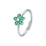 Anello donna in acciaio con fiore e zircone verde Misura regolabile Misura fiore: 8 x 8 mm Diametro zirconi: 2,5 mm. Ispirato alla bellezza della natura, questo gioiello incanta con il suo design floreale raffinato. Perfetto per chi desidera aggiungere un tocco di delicatezza e grazia al proprio stile quotidiano, trasmette una sensazione di freschezza e femminilità .