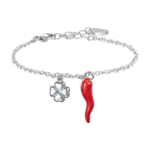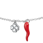 Bracciale in acciaio con corno rosso e quadrifoglio. Lunghezza: 16 + 3 cm Misura corno: 4,5 x 17 mm Misura cuore charm: 8 x 1,5 mm Porta fortuna e stile al polso con questo bracciale in acciaio caratterizzato da un corno rosso e un quadrifoglio. Il design elegante lo rende perfetto per ogni outfit, mentre i dettagli simbolici aggiungono un elemento di fascino e personalità. Ideale per chi cerca un accessorio dal significato speciale.