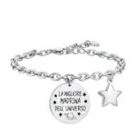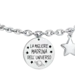 Bracciale Donna in acciaio La migliore madrina dell’universo. Lunghezza: 16,5 + 3 cm. Diametro piastra: 20 mm. Spessore catena: 4 mm. La migliore madrina dell’universo. Grazie per essere stata la mia guida, il mio sostegno e la mia ispirazione. Questo bracciale rappresenta un tributo speciale alla figura della madrina e alla relazione unica che condivide con il proprio figlioccio o figlioccia. Rappresenta un regalo perfetto perché trasmette un forte senso di apprezzamento e affetto per il ruolo speciale della madrina nella vita del figlioccio/a, rendendo il bracciale un ricordo duraturo e significativo del loro legame affettivo
