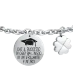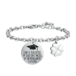 Bracciale donna in acciaio “Che il successo di oggi sia l’inizio di un brillante futuro” con piastra con smalto nero e charm quadrifoglio Lunghezza: 16 + 3 cm Misura piastra: 20 mm