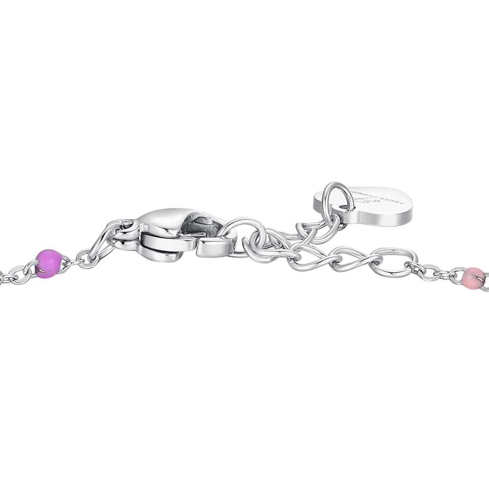 Bracciale bambina in acciaio con piastra, Angelo ed elementi multicolor Lunghezza: 14 + 2 cm Misura piastra: 17 x 3,5 mm Misura Angelo: 5 x 6 mm
