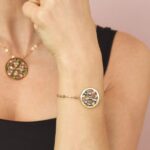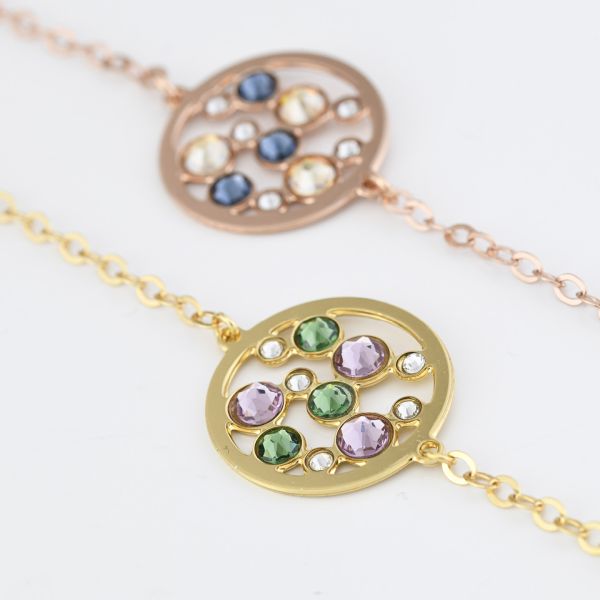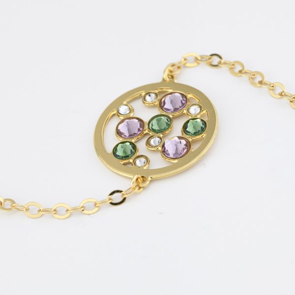 Bracciale placcato oro giallo con decoro a cerchio di cristalli crystal, verde erinite e light ametist.