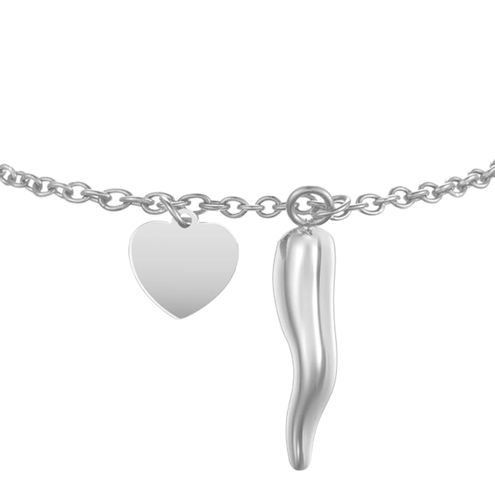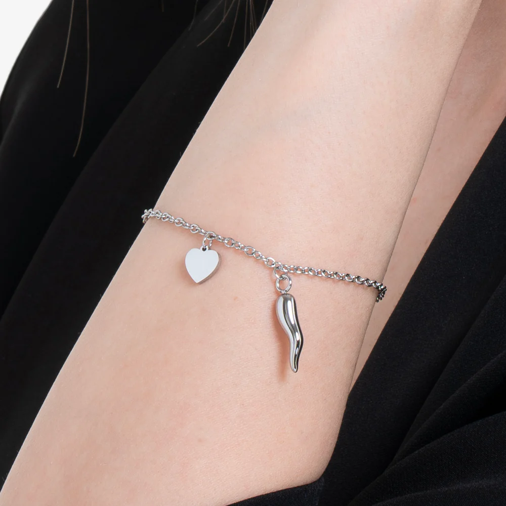 Bracciale in acciaio con cuore e corno. Lunghezza: 16 + 3 cm. Il bracciale in acciaio con pendente a forma di cuore e corno è un gioiello semplice, lo stile minimal della catenina lo rende adatto ad ogni stile, da quello più particolare a quello più brioso. L’accessorio è l’ideale come idea regalo speciale e simpatica, un piccolo portafortuna da portarsi sempre dietro nei momenti più importanti. Il corno e il cuore oltre ad essere di buon auspicio danno movimento all’accessorio.