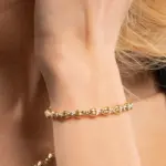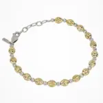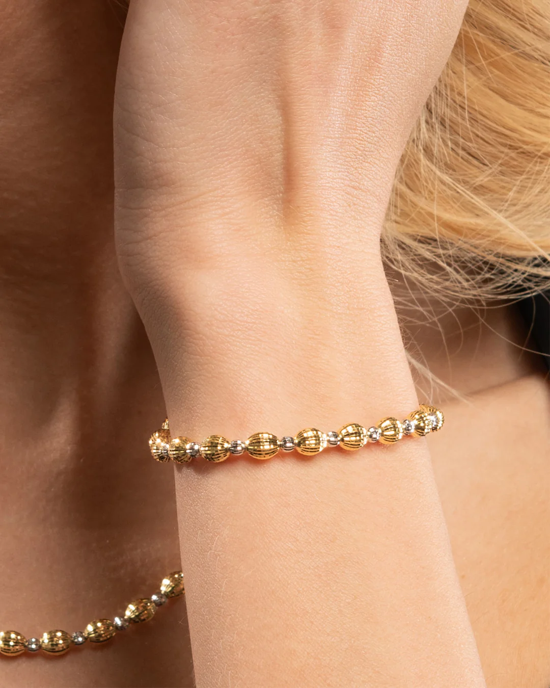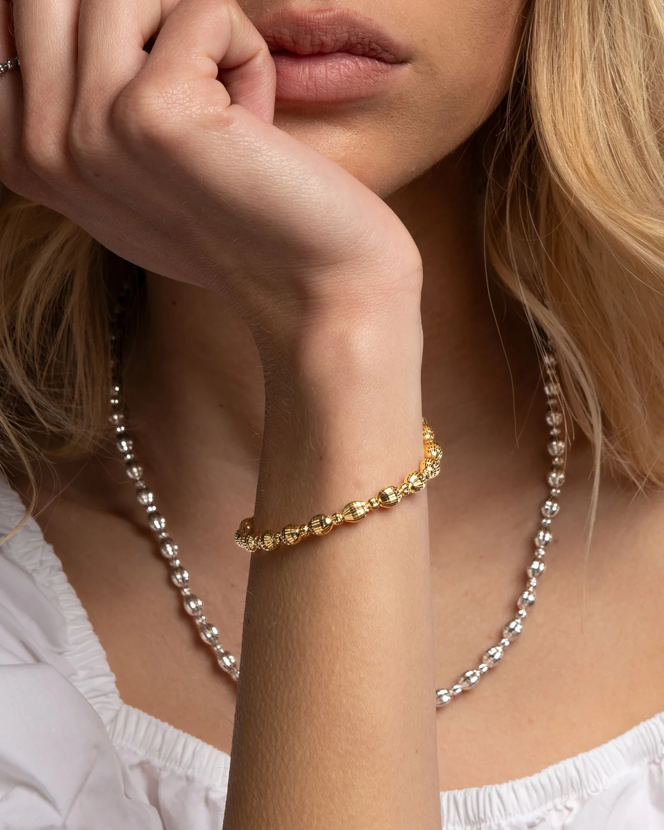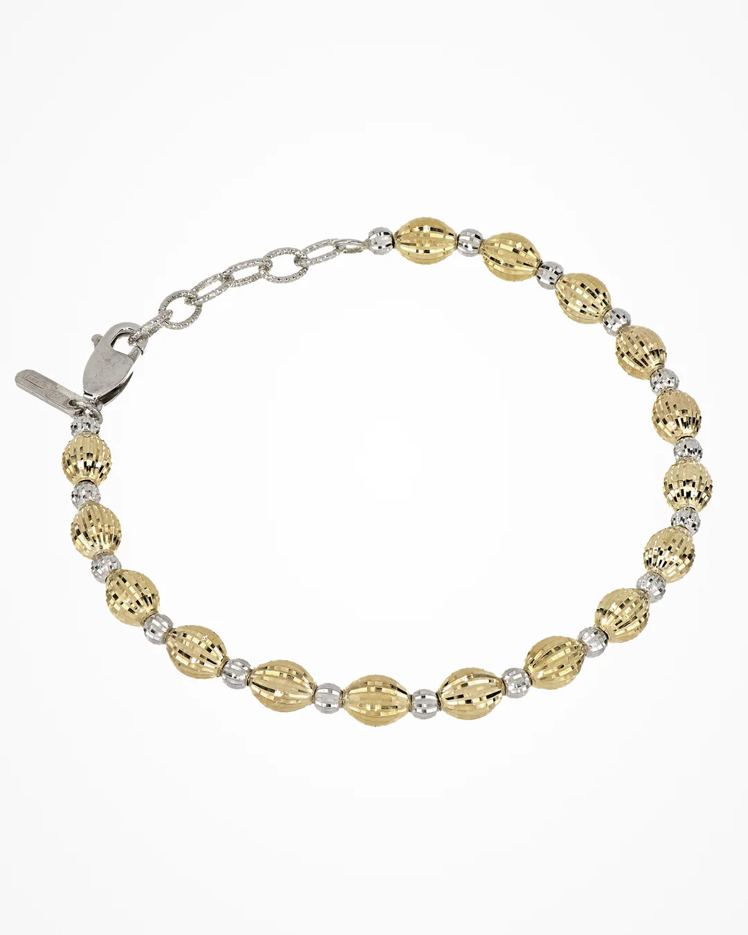 Bracciale in argento a palline infilate e diamantate. I due elementi hanno forma e dimensione diverse per creare un gioco di spessori e di luce.