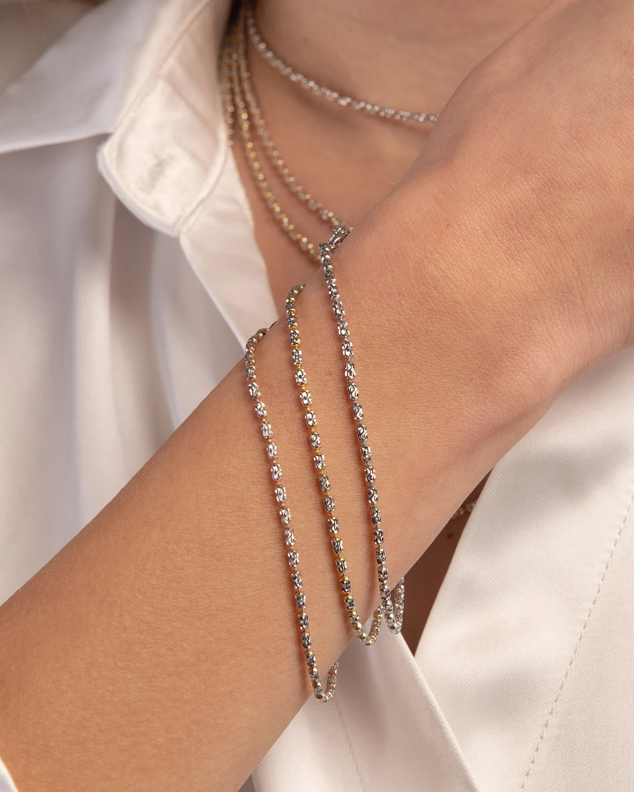 Bracciale in argento con una sottile catena di elementi cilindrici diamantati che regalano una brillantezza unica, che dura nel tempo.