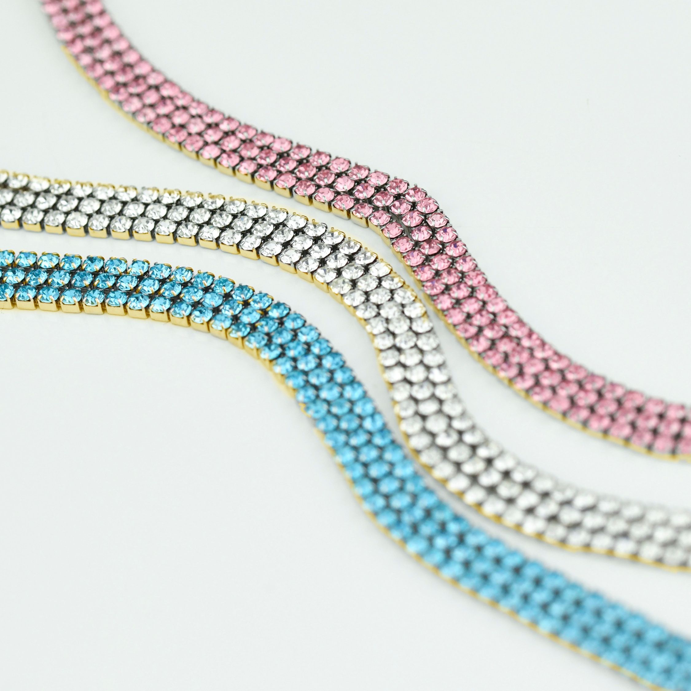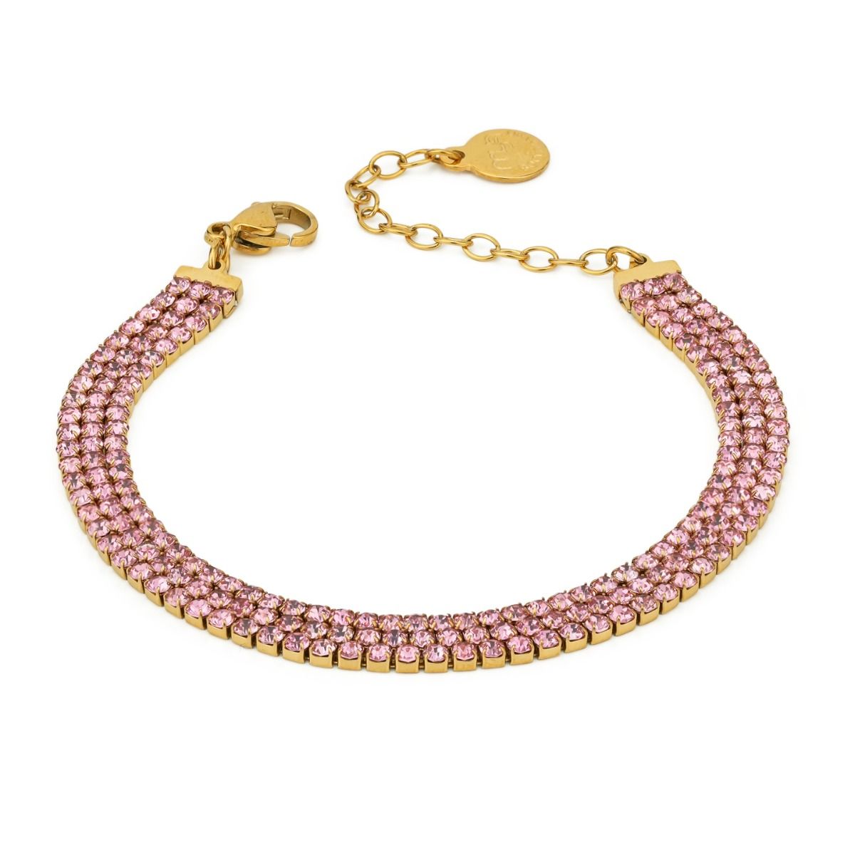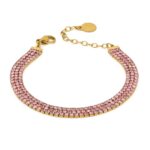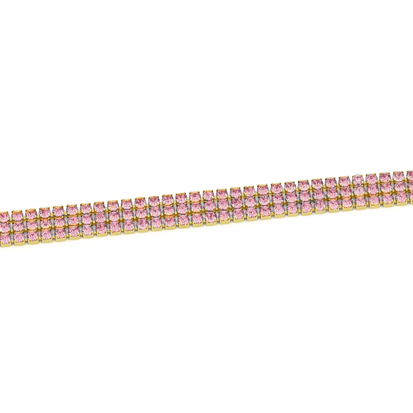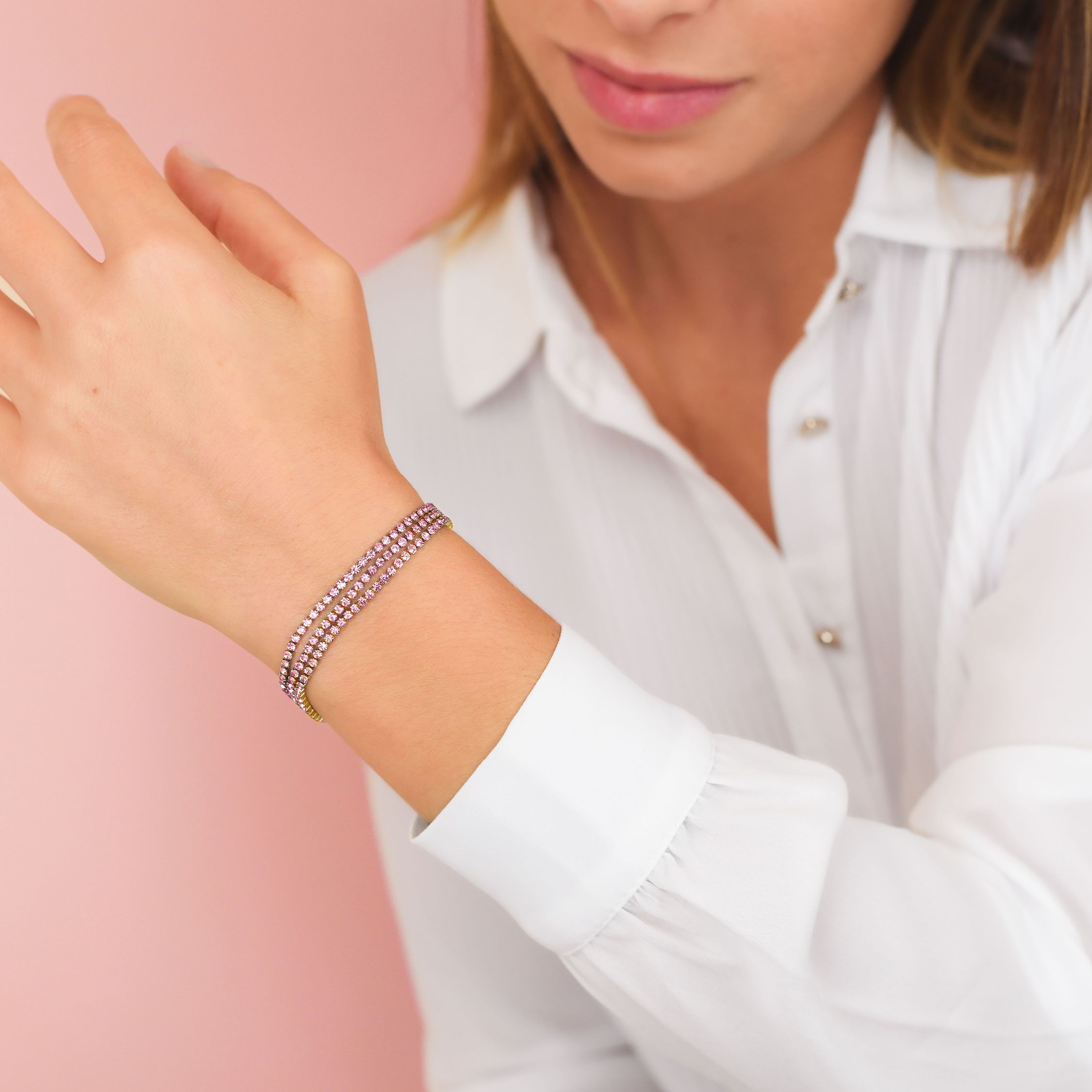 Bracciale placcato oro giallo, modello tennis, a tre fili di zirconi rosa