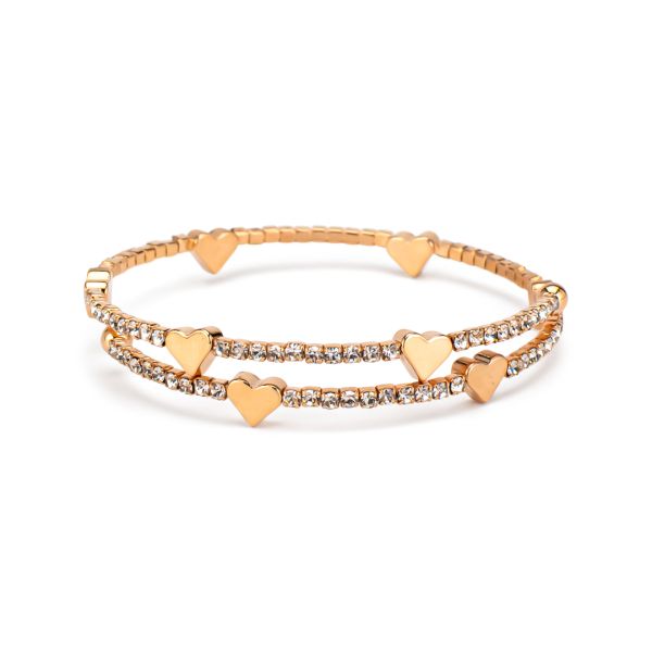 Bracciale rigido in bronzo con anima in acciaio armonico, placcato in oro rosa, passanti tennis di strass e moduli a forma di cuore.