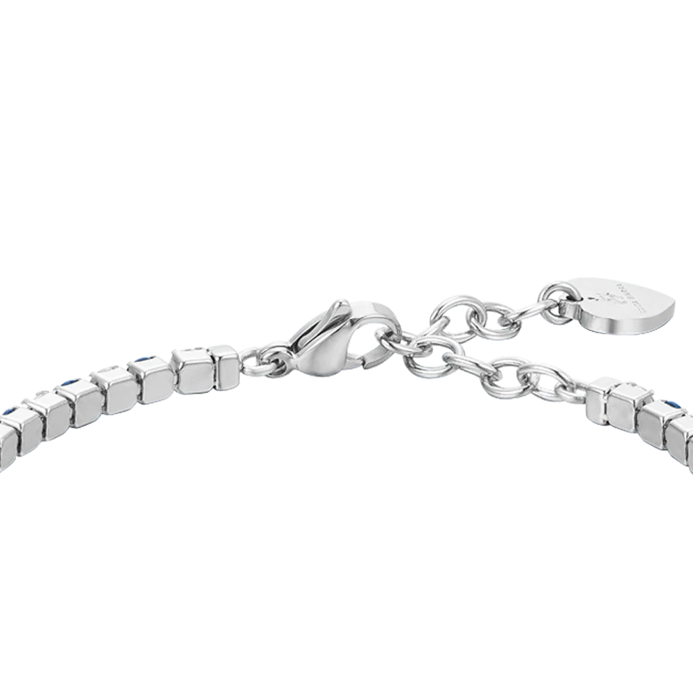 Bracciale tennis Donna in acciaio con cristalli blu e bianchi. Lunghezza: 15 + 3 cm. Misura cristalli: 3 mm. Indossa l’Eleganza Oceanica con il Bracciale Tennis Donna in Acciaio con Cristalli Blu e Bianchi. I cristalli blu, richiamando le profondità oceaniche, si uniscono alla purezza dei cristalli bianchi, creando un effetto di onda scintillante.