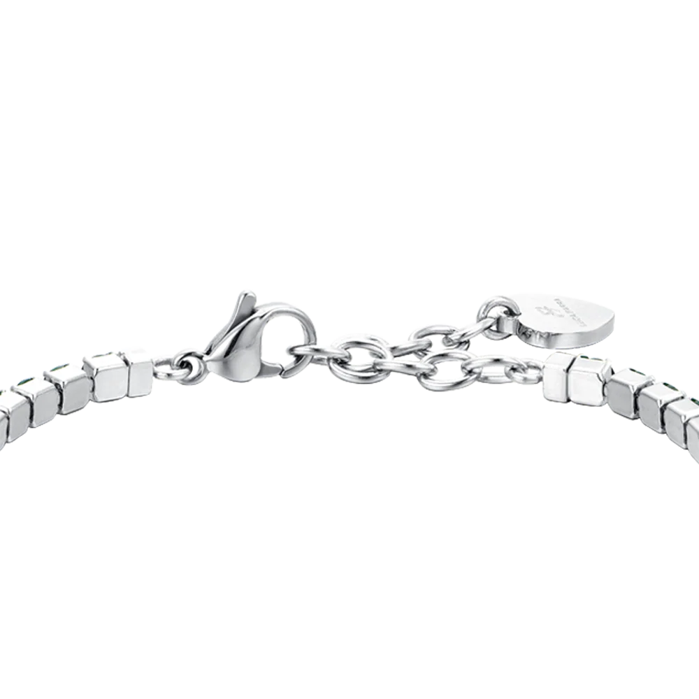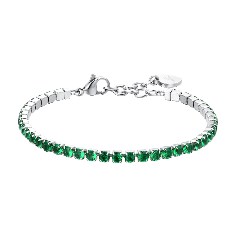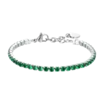 Bracciale tennis Donna in acciaio con cristalli verdi. Lunghezza: 15 + 3 cm. Misura cristalli: 3 mm. I cristalli verdi del bracciale rappresentano la rigenerazione, la vitalità e la crescita, trasmettendo un senso di armonia e equilibrio. Indossare questo bracciale non è solo una dichiarazione di stile, ma anche un modo per connettersi con la natura e i suoi cicli di rinnovamento.