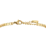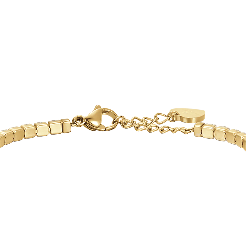 Bracciale Tennis in acciaio dorato con cristalli bianchi. Lunghezza: 15 + 3 cm. Questo affascinante bracciale femminile in acciaio IP gold è l’accessorio perfetto da indossare per brillare. Il design con cristalli bianchi aggiunge un tocco di luminosità al tuo look. Aggiungi un po’ di luce al tuo outfit con questo meraviglioso bracciale!