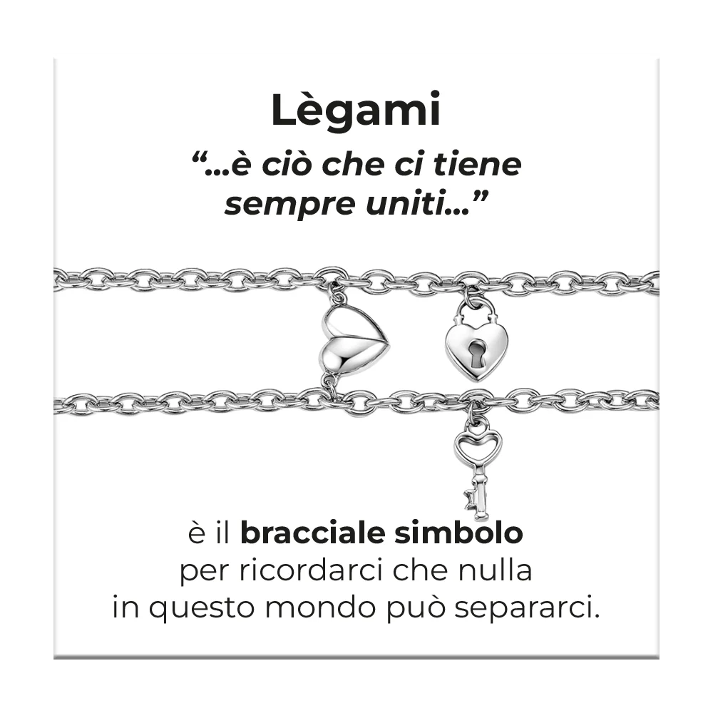 Bracciali donna e uomo in acciaio con cuore calamitato Lunghezza bracciale donna: 16 + 3 cm Lunghezza bracciale uomo: 19 + 3 cm Misura cuore: 5 x 5 mm Misura lucchetto: 10 x 14 mm Misura chiave: 8 x 18 mm