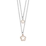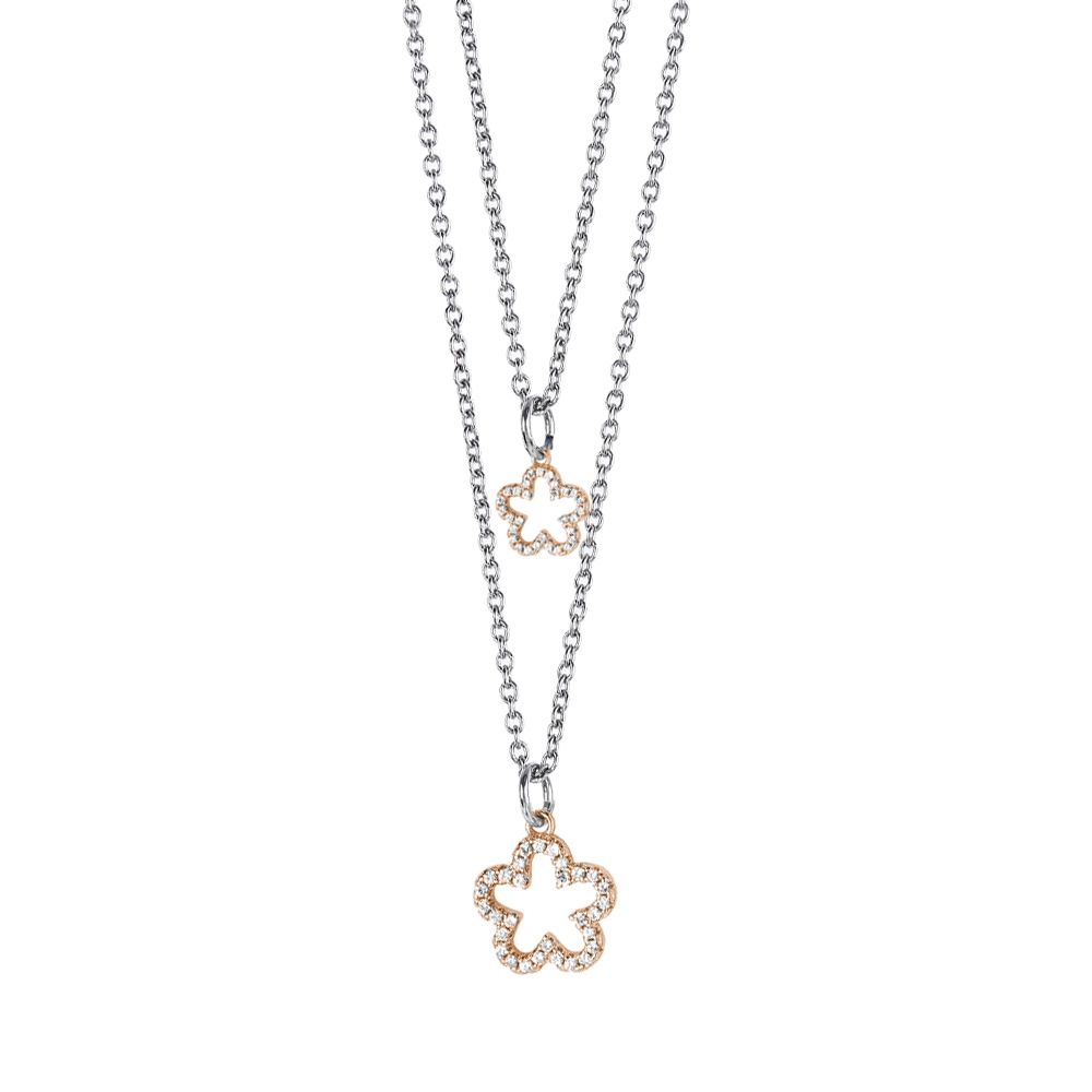Collana doppio filo degradè in acciaio con fiori pendenti in bronzo placcati oro rosa dal profilo di zirconi. Lunghezza filo più corto cm 38; lunghezza filo più lungo cm 43 e allungamento di cm 5,5.
