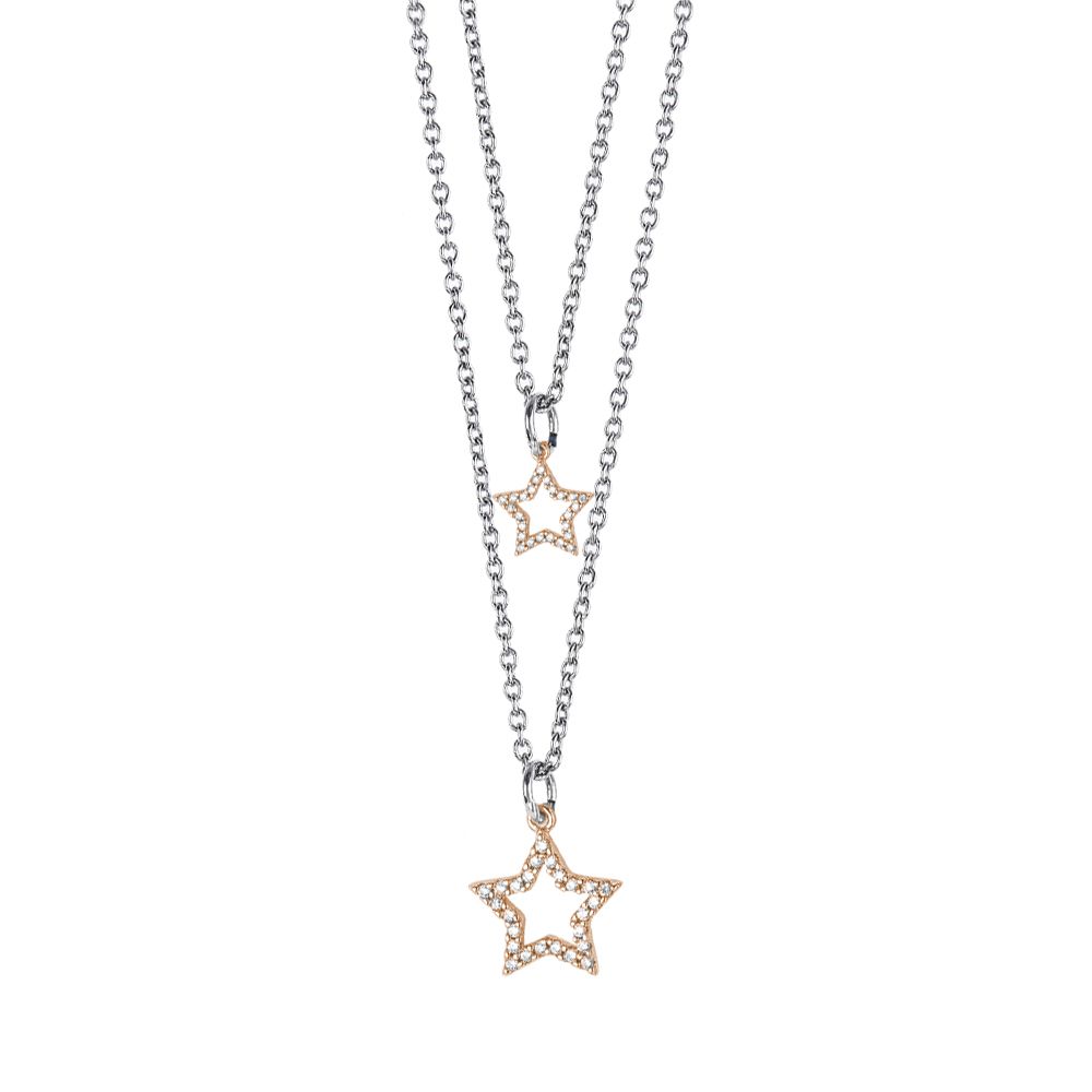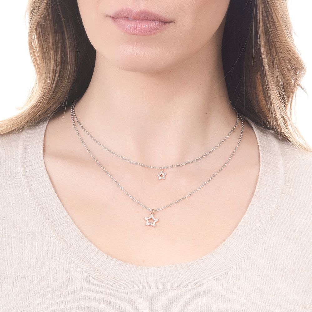 Collana doppio filo degradè in acciaio con stelle pendenti in bronzo placcato oro rosa dal profilo di zirconi. Lunghezza filo più corto cm 38; lunghezza filo più lungo cm 43 e allungamento di cm 5,5.