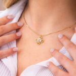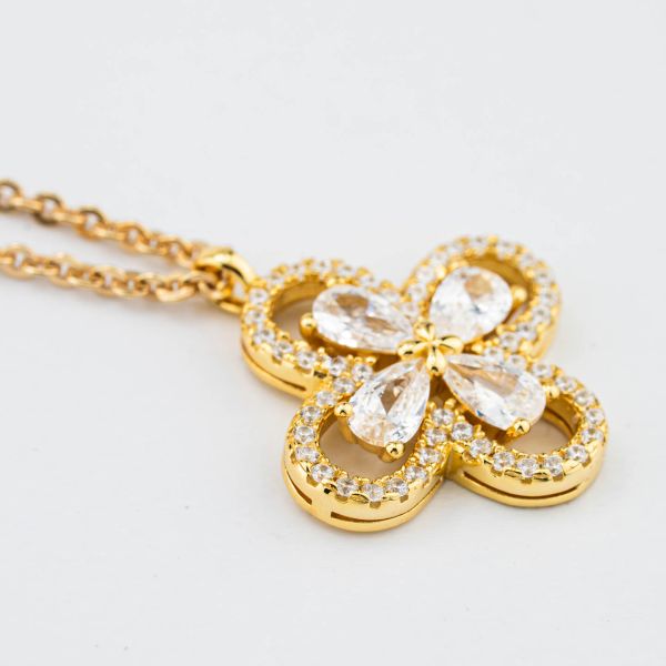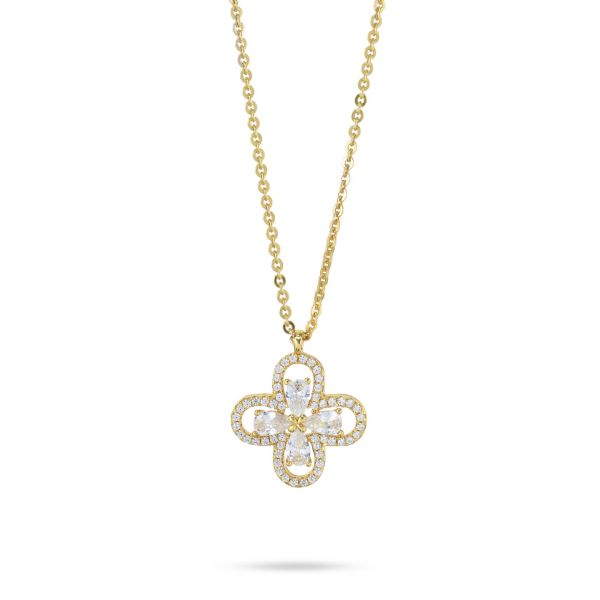 Collana girocollo placcata oro giallo con quadrifoglio pendente definito da zirconi e fiore centrale crystal