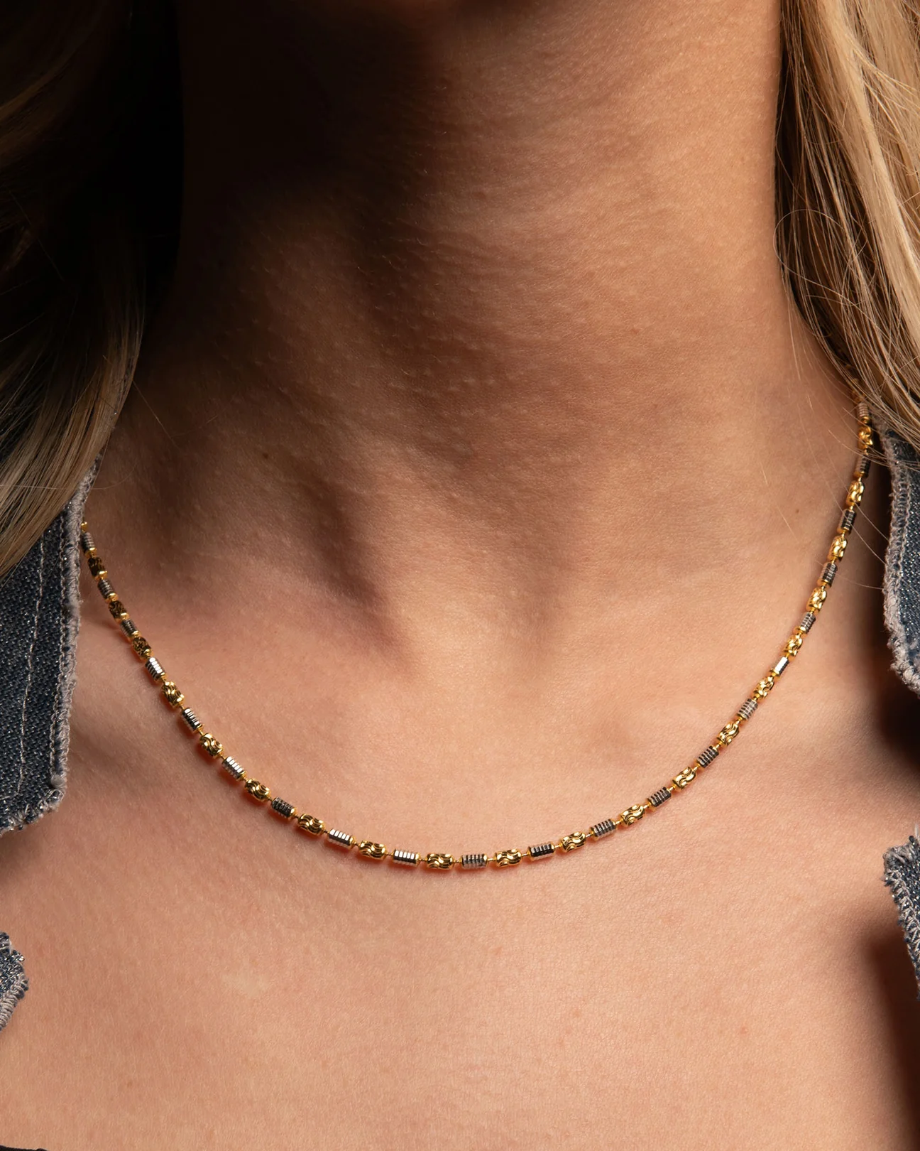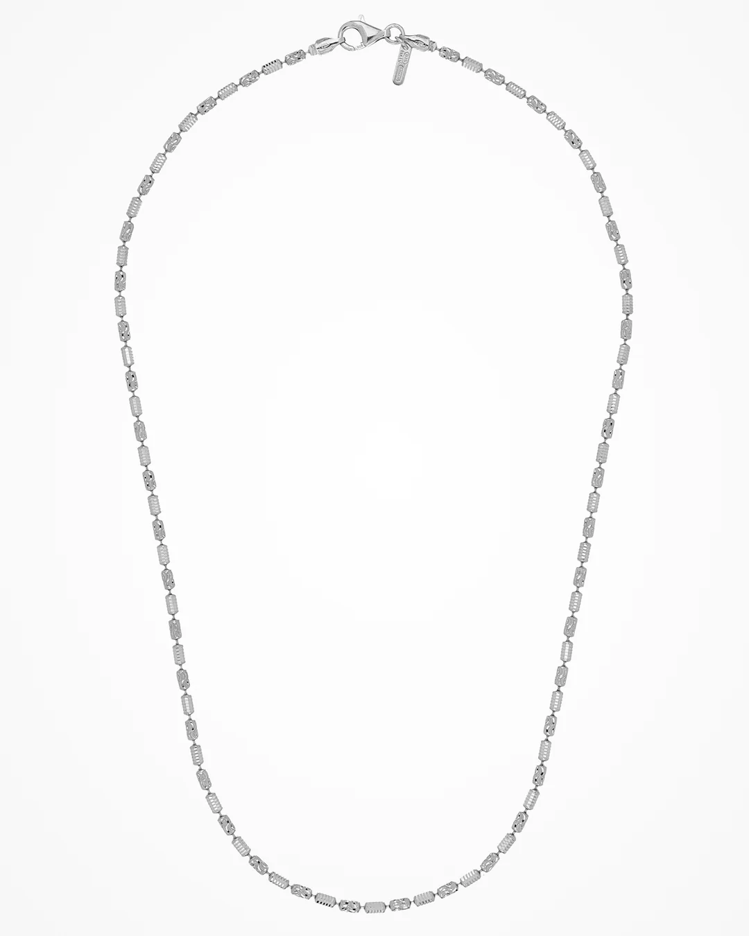 Collana in argento con catena a palline di elementi cilindrici a diamantature alternate, per una luminosità che dura nel tempo.