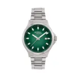 L’orologio da uomo Kai, nella versione solo tempo, unisce eleganza e carattere. Il suo quadrante verde sfumato, vero protagonista, cattura la luce con sfumature sofisticate, donando profondità e dinamismo al design. Gli indici arricchiti con trattamento luminous e datario garantiscono una perfetta leggibilità e stile.