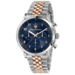 Orologio cronografo da Uomo MASERATI della collezione Epoca con movimento al quarzo, cassa 42 mm in acciaio inox, quadrante analogico blu, indici con numeri arabi di colore rosé, lancette con inserto luminescente in modo che l’ora sia leggibile anche in condizioni di scarsa illuminazione e vetro minerale – Il cinturino, modello jubilee, è in acciaio inox con inserto centrale in PVD rose gold e monta una chiusura deployante con doppio pulsante – Il fondello e la corona sono a vite per una maggiore garanzia di impermeabilità – Orologio impermeabile a 10 ATM