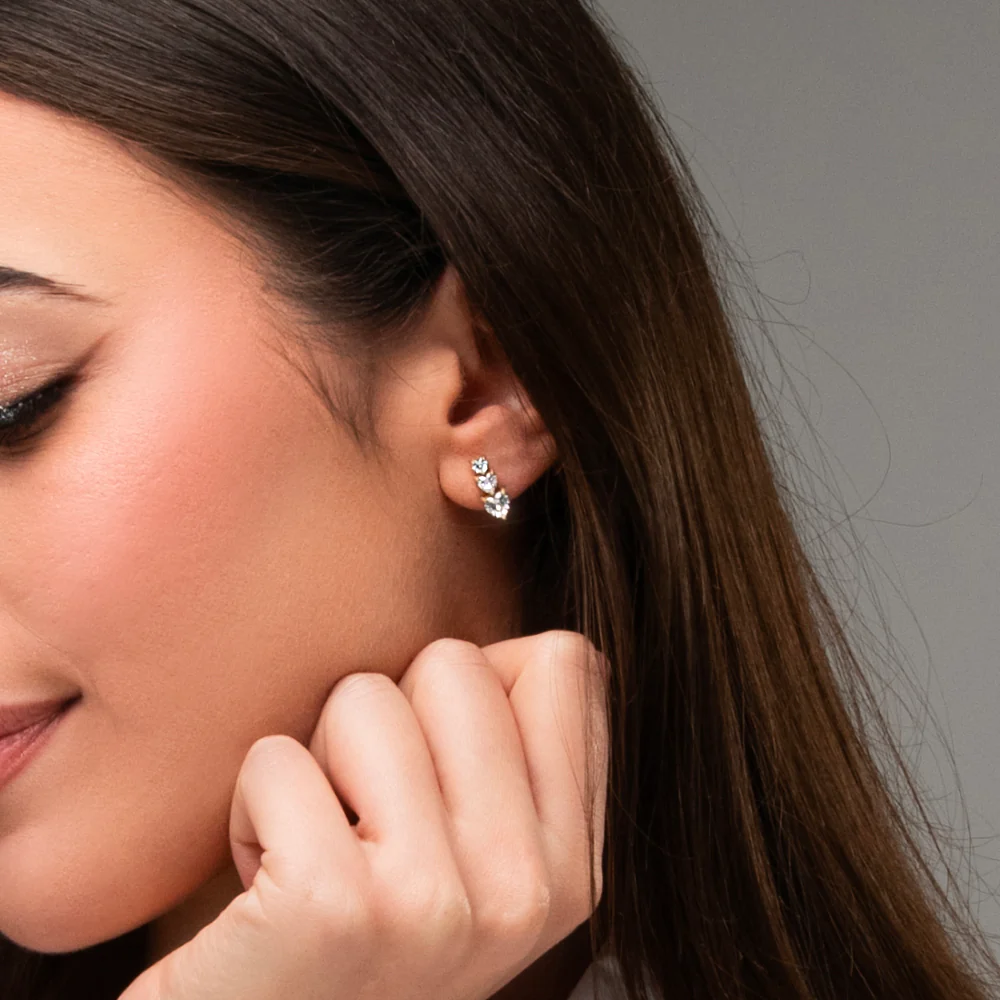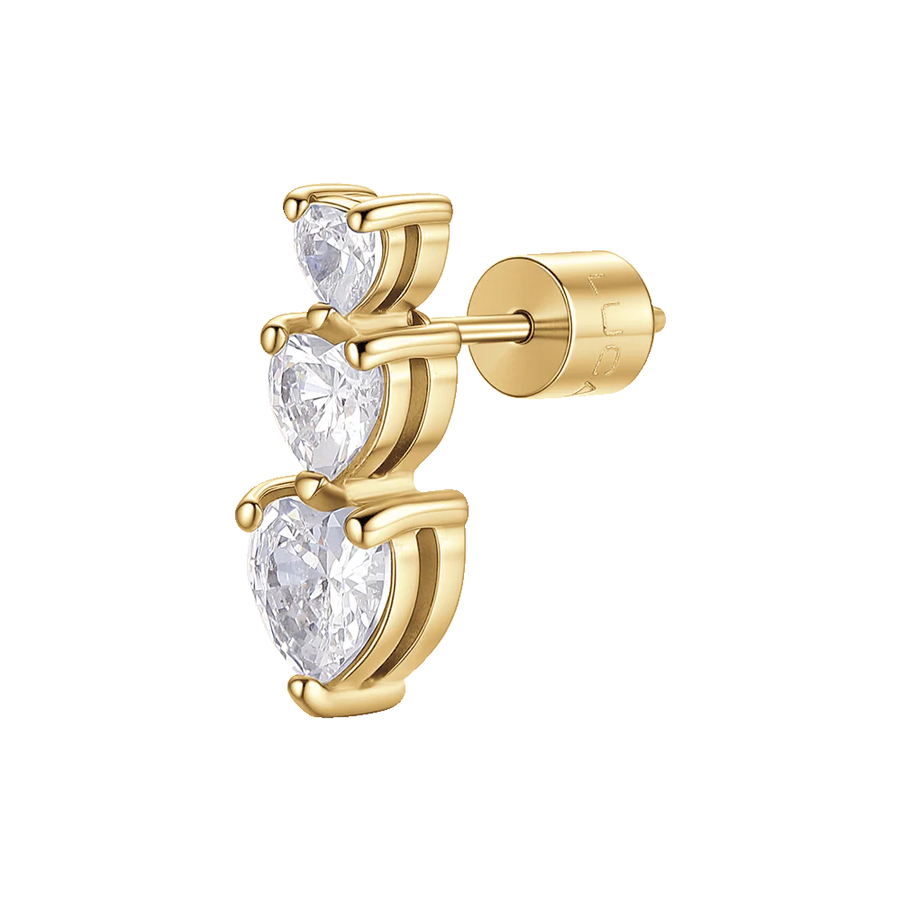Mono orecchino donna in acciaio IP gold, cuori con zirconi bianchi Lunghezza: 1,4 cm Misura cuore: 5 x 5, 4 x 4, 3 x 3 mm