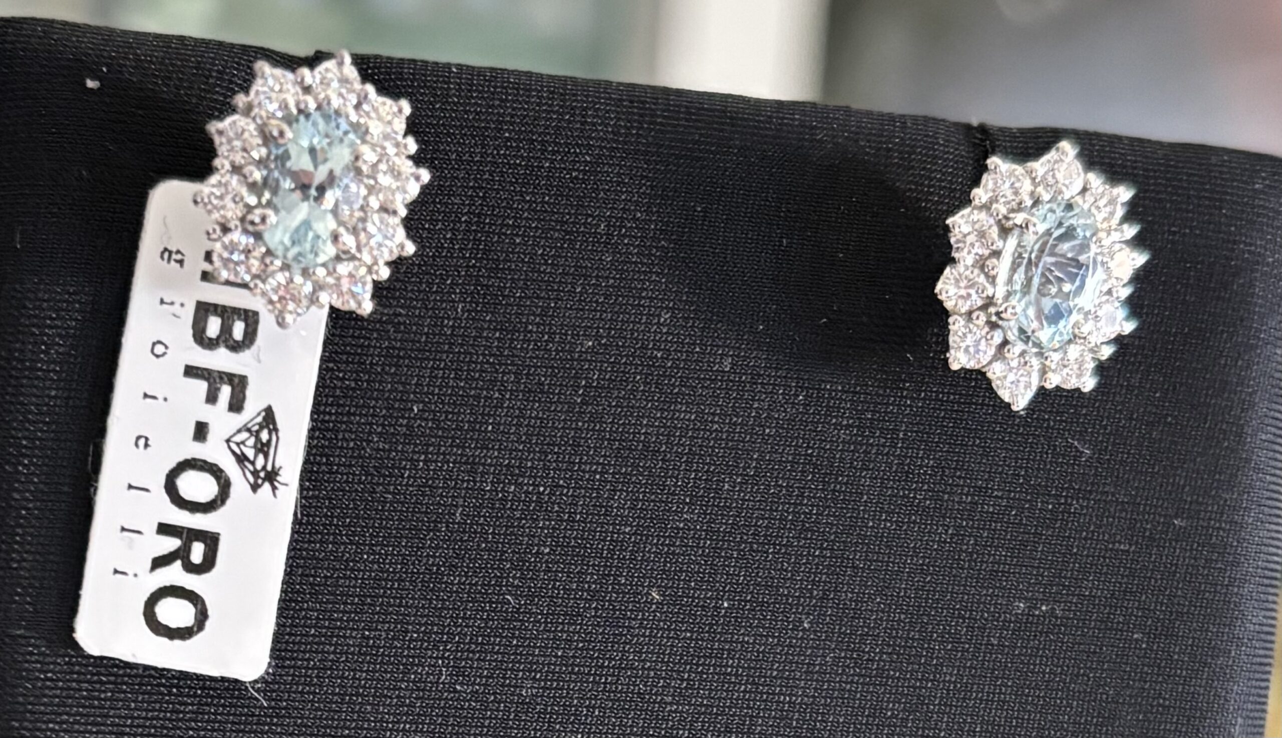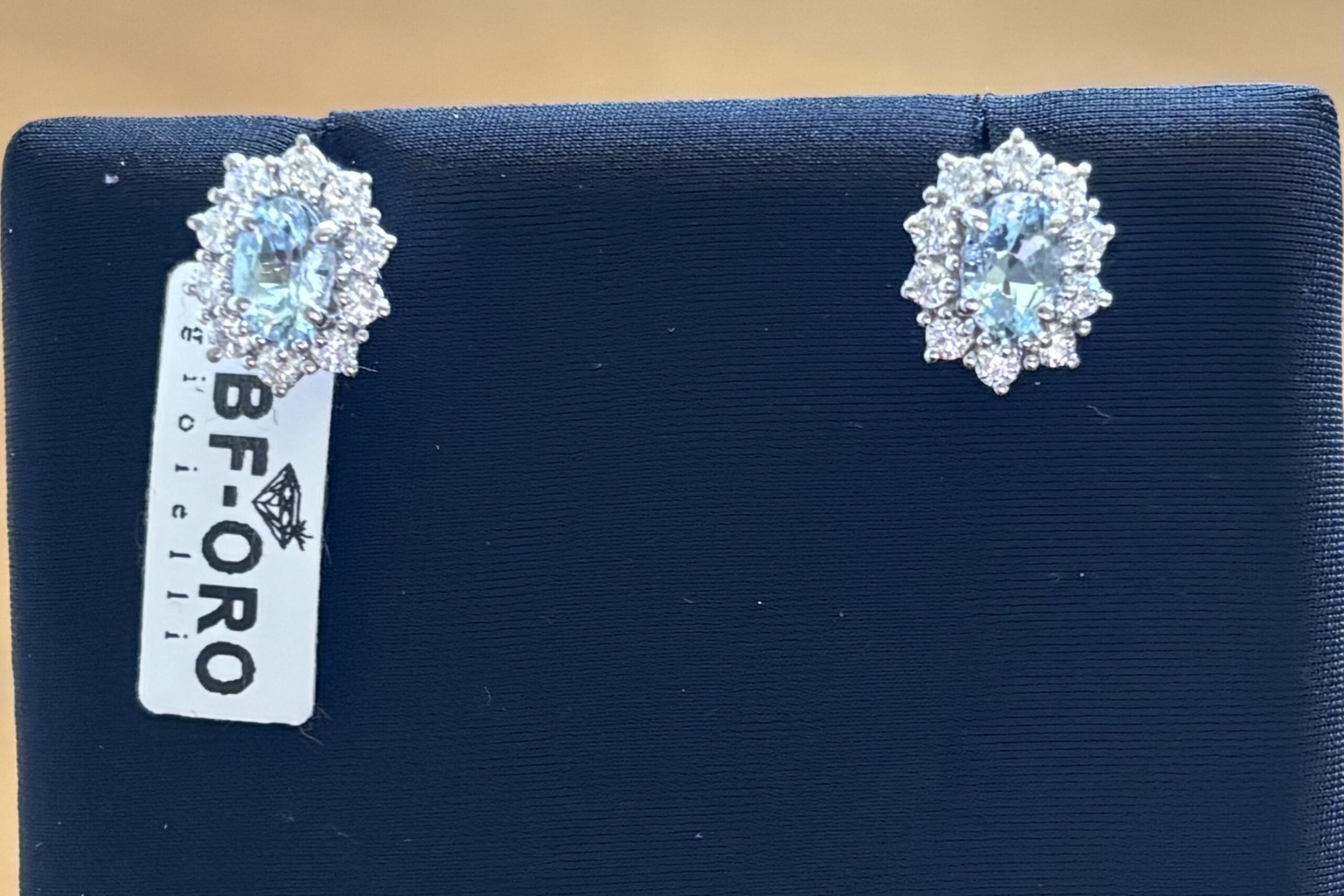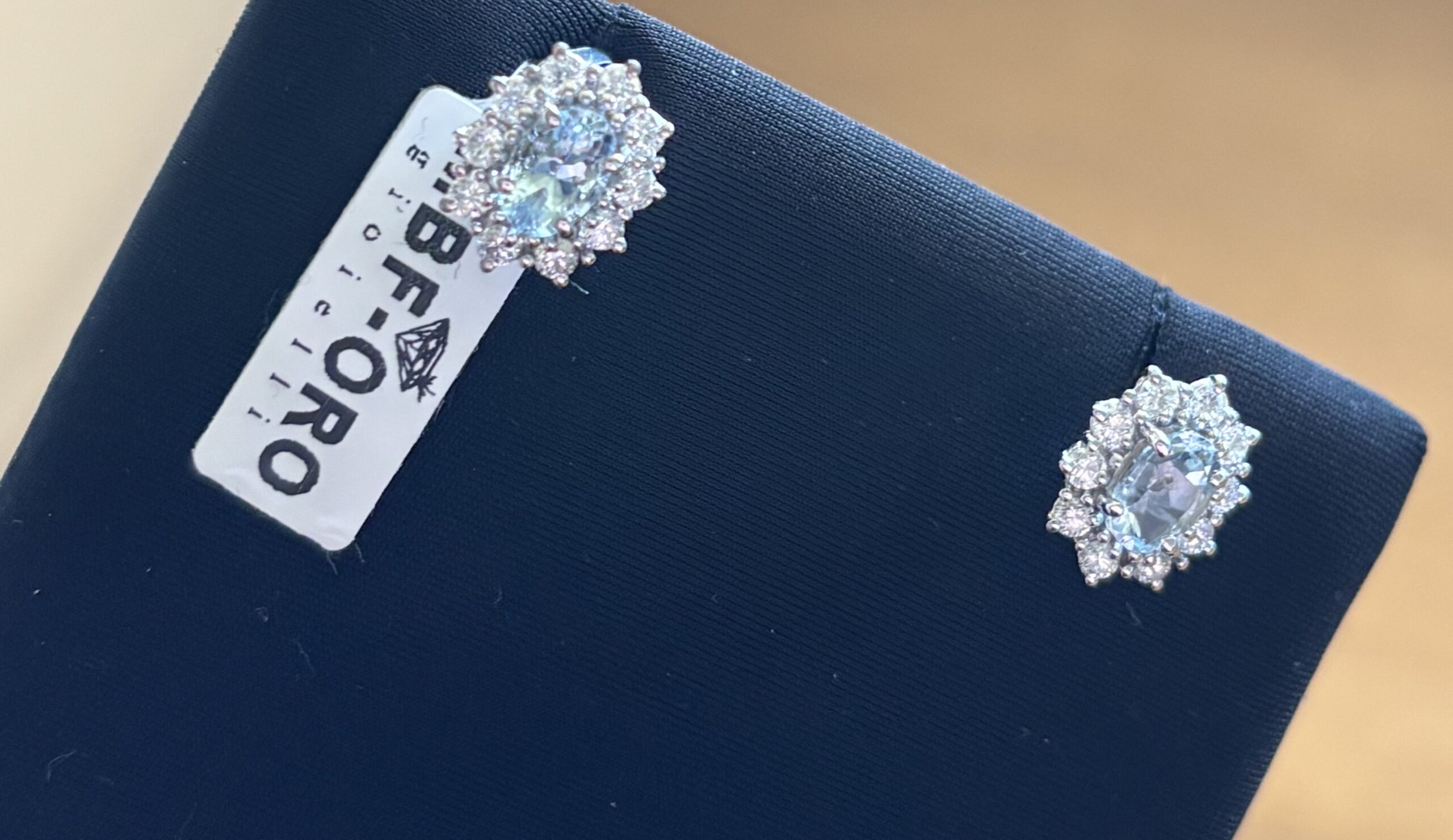 Gli Orecchini Acqua hanno un’importante Acquamarina naturale contornata da 10 piccoli diamanti che arricchiscono questa creazione circondando l’Acquamarina centrale; sono racchiusi in griffe tonde che partono dal basso e avvolgono l’Acquamarina naturale fino a formare un cestino.