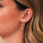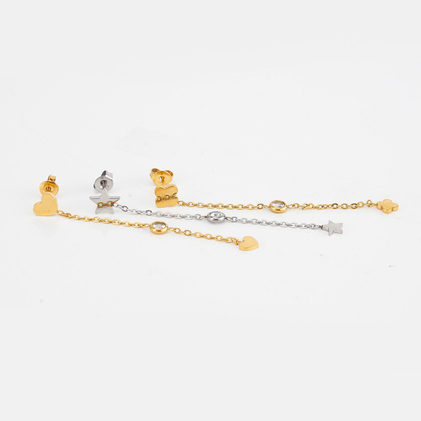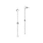 Orecchini in acciaio rodiato con ciondoli a forma di stella alternati a cristalli circolari di colore bianco.