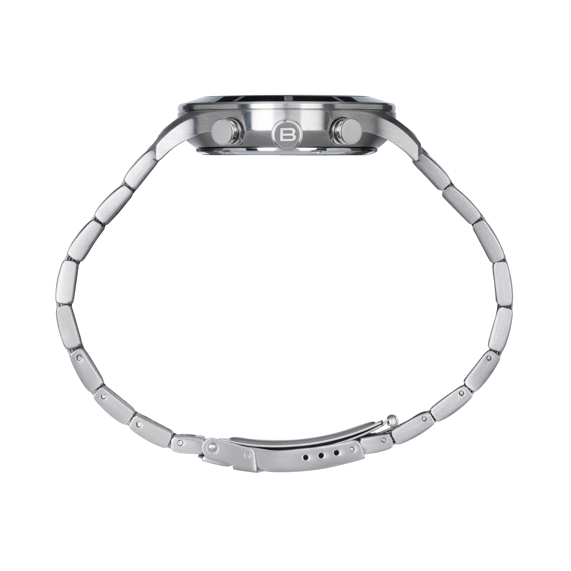 Il cronografo da uomo Remixer presenta una cassa e un bracciale in acciaio accostati a un quadrante blu con effetto sunray, illuminato da dettagli in acciaio e contatori neri a contrasto con lavorazione CD ring. La lunetta è in alluminio nero anodizzato. La finitura bilux lucida e satinata del bracciale arricchisce questo orologio di stile.